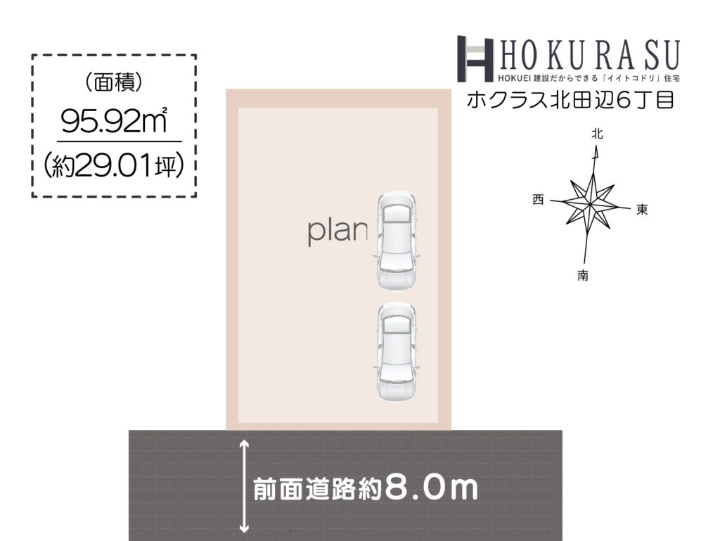 前面道路の幅員が8mと非常に広く、車の出し入れがスムーズで安心です。
